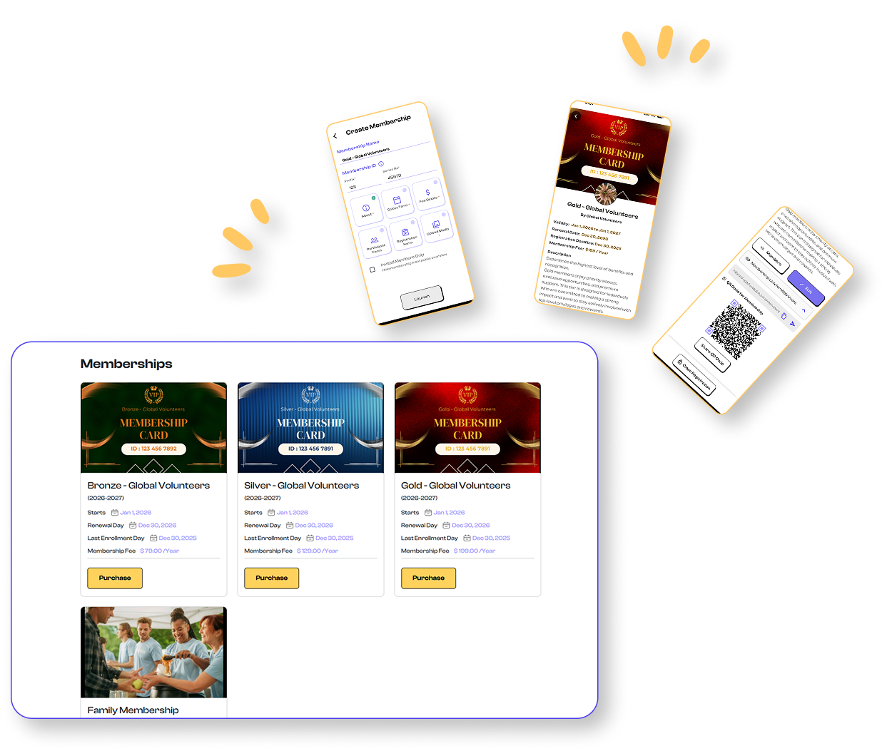Each active member receives a digital membership card showing their name, photo, membership tier, validity dates, and a unique QR code for verification. Organizations can scan QR codes at events or venues.