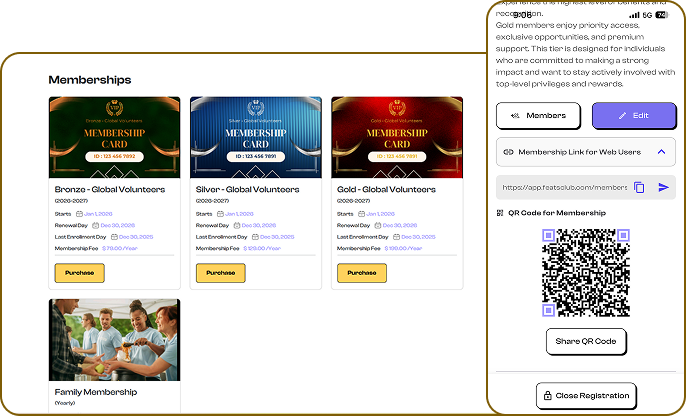 Manage memberships and class or club fees seamlessly with online and offline payment options, plus lifetime, annual, or recurring plans.